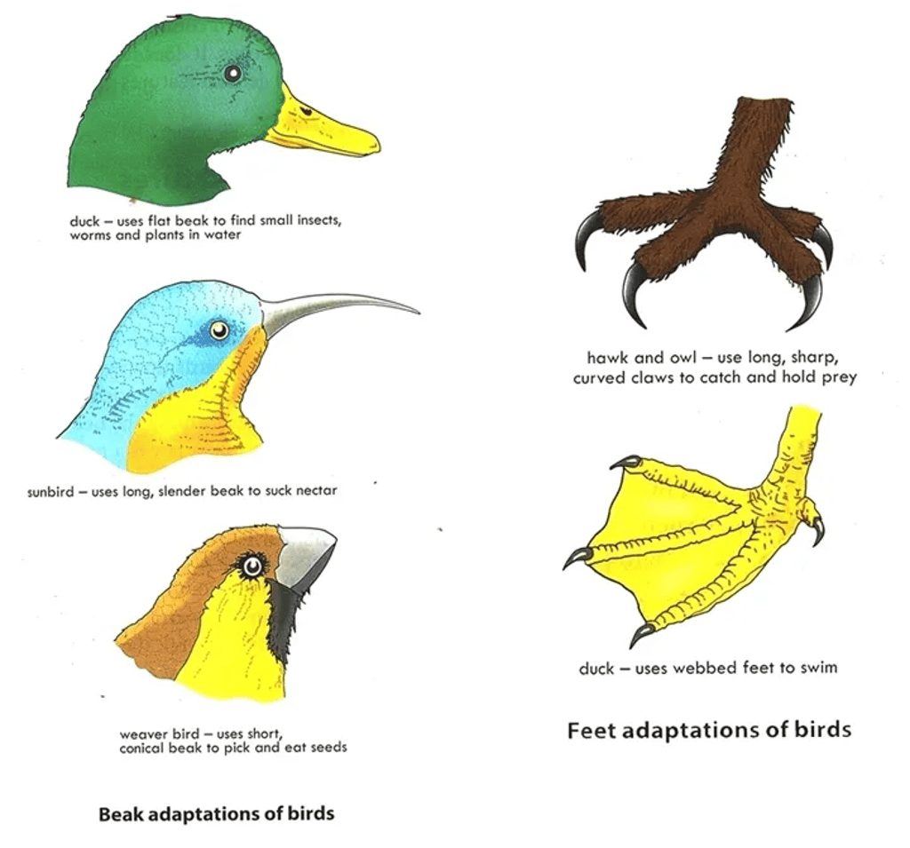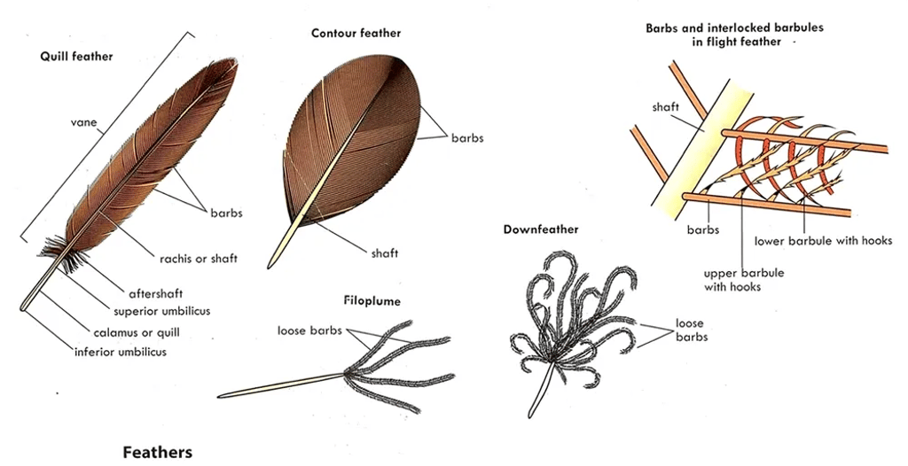 □Flight or quills feathers: are broad and flat and offer resistance to the passage of air. It consists of a flexible shaft running down the center. The lower part of the shaft is hollow and forms the quill. The quill has a hole at the posterior end called inferior umbilicus, which contains a piece of papilla tissue. The base of the quill is embedded in a small pit in the skin called the follicle. The shaft bears a large number of a filaments called barbs. Each barb bears on each side a row of small branches called barbules. The barbules of the upper row have hooks and those on the lower row have grooves or ridges. The hooks on one set of barbules interlock with ridges on the other set to form a stiff barb called the vane. The quill feathers are found on the wing and tail. They are used for flying, steering and balancing. They are also used for sexual display during courtship.
